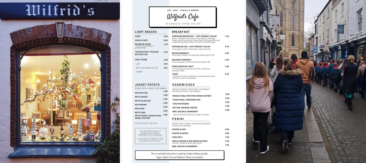 Discover Wilfrid's Cafe in Ripon, UK – a dog-friendly haven offering a delightful selection of vegan and gluten-free options. Enjoy lunch with our delicious pies, paninis, and freshly baked scones. Join us for a cozy dining experience near the stunning cathedral, where choice and comfort meet!